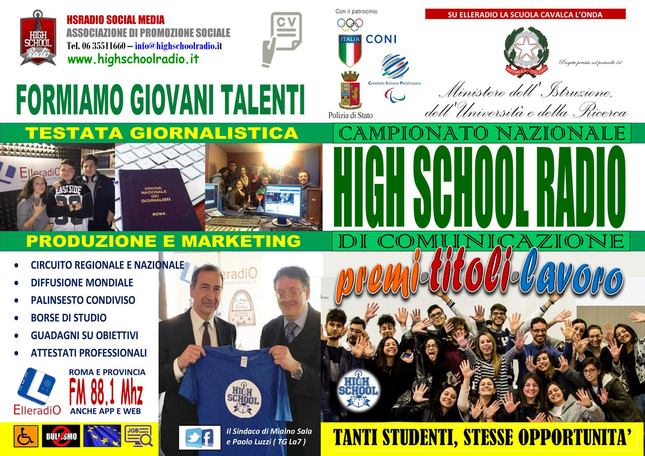 High School Radio opera con i ragazzi fin dal 2013. In questi 10 anni ha ottenuto attestazioni e riconoscimenti di valenza nazionale quali il patrocinio della Presidenza del Consiglio di 3 governi diversi, della Polizia di Stato, del CONI, del Comitato Italiano Paraolimpico, di 10 regioni, ed altrettante Provincie e di 30 comuni, tra i quali Roma, Milano e Napoli.
